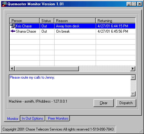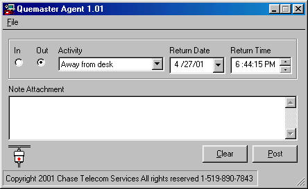 Quemaster not only keeps track of the In or Out status of its users, but also the current activity they are engaged in. All changes in status are time and date stamped for reporting purposes. Users can optionally indicate the date and time when they will be returning to an available state.